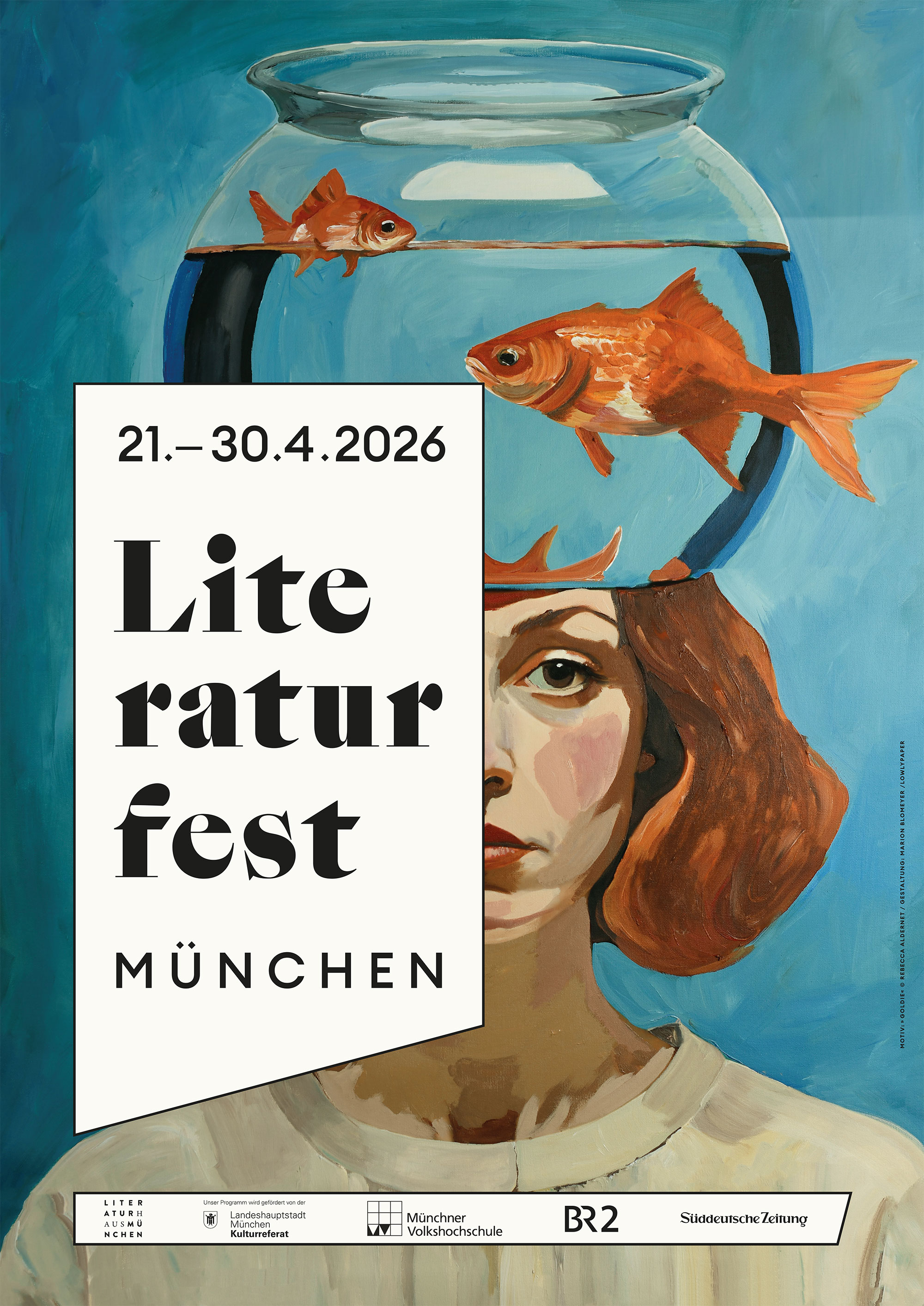 Plakatmotiv LITERATURFEST MÜNCHEN 2026 / rosa »GOLDIE« © REBECCA ALDERNET / GESTALTUNG: MARION BLOMEYER / LOWLYPAPER als jpg-Datei