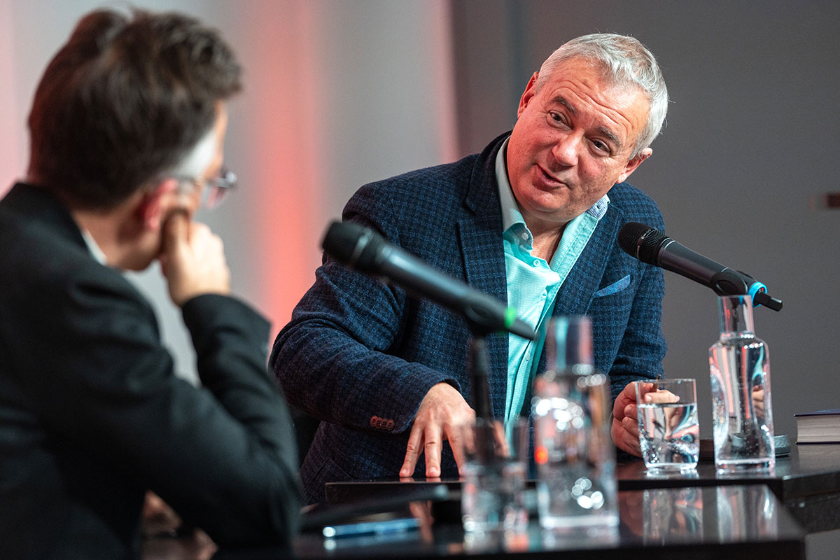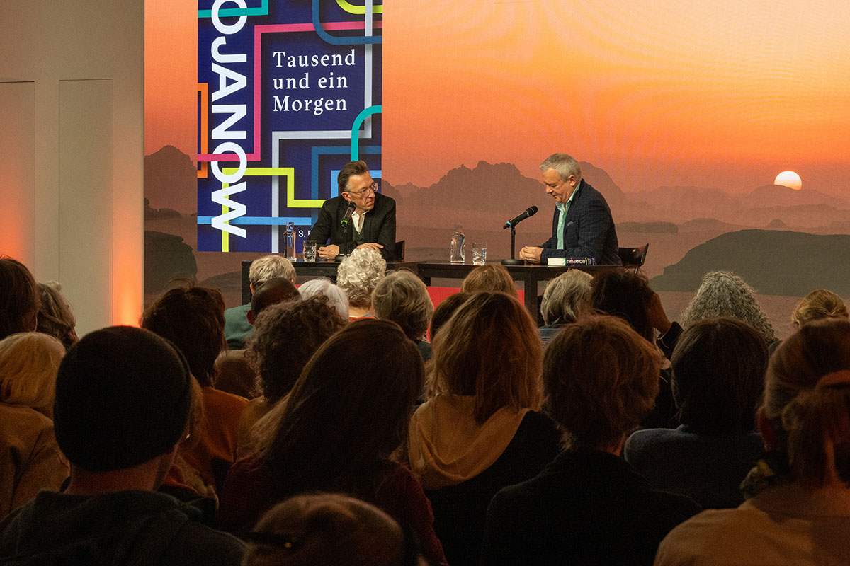 Im Anschluss auf der Bühne: der »Weltensammler« Ilija Trojanow, der bereits im Jahr 2007 den Essay »Kampfabsage. Kulturen bekämpfen sich nicht, sie fließen zusammen« (Blessing [s] zusammen mit Ranjit Hoskoté) veröffentlichte. In seinem neuen Roman »Tausend und ein Morgen« (S. Fischer) entwirft er die Utopie einer friedlichen und selbstbestimmten Gesellschaft. Märchen oder Möglichkeit?