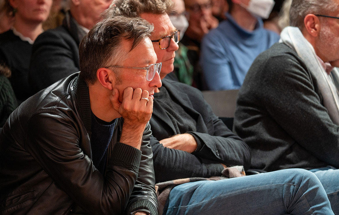 19.11.: Lukas Bärfuss im Gespräch mit Tina Rausch (im Hintergrund: Valentin Groebner) / FORUM © Pierre Jarawan