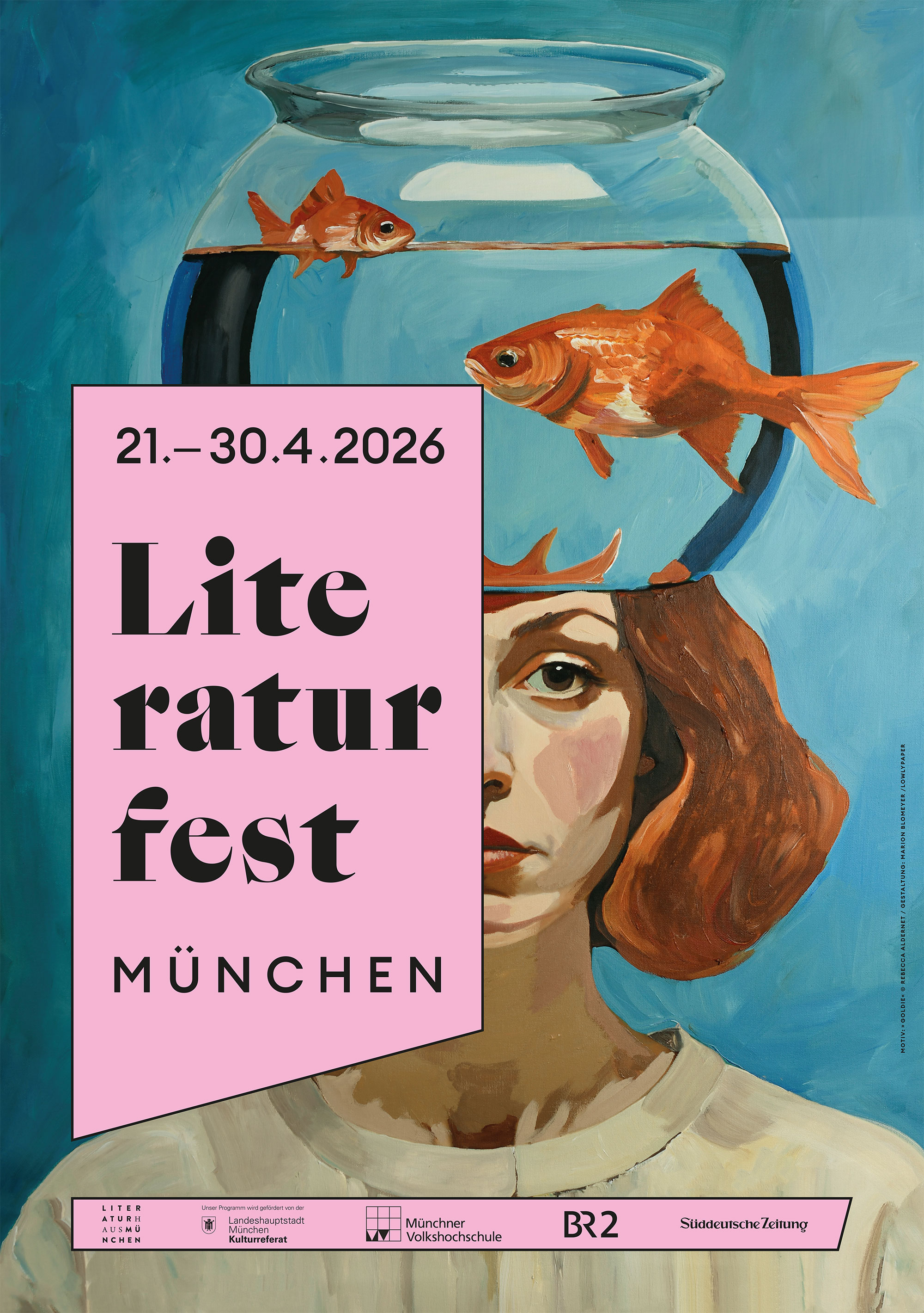 Plakatmotiv LITERATURFEST MÜNCHEN 2026 / rosa »GOLDIE« © REBECCA ALDERNET / GESTALTUNG: MARION BLOMEYER / LOWLYPAPER als jpg-Datei