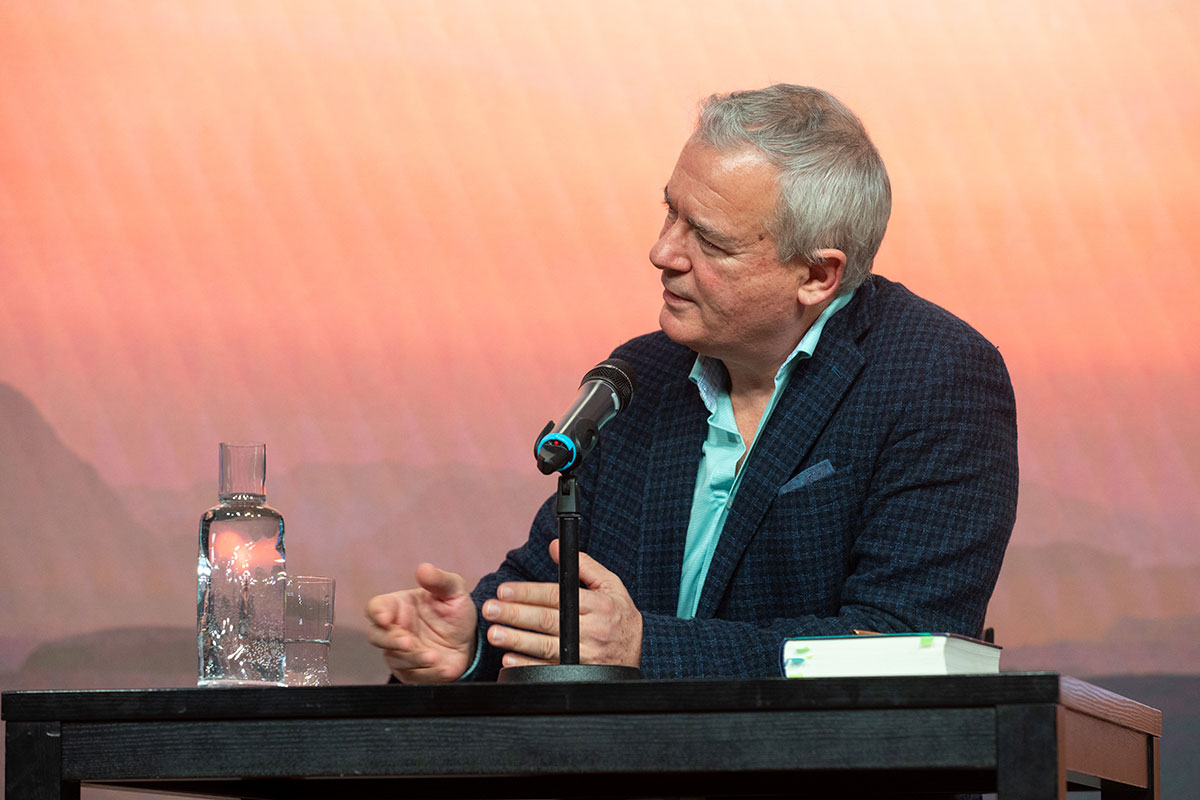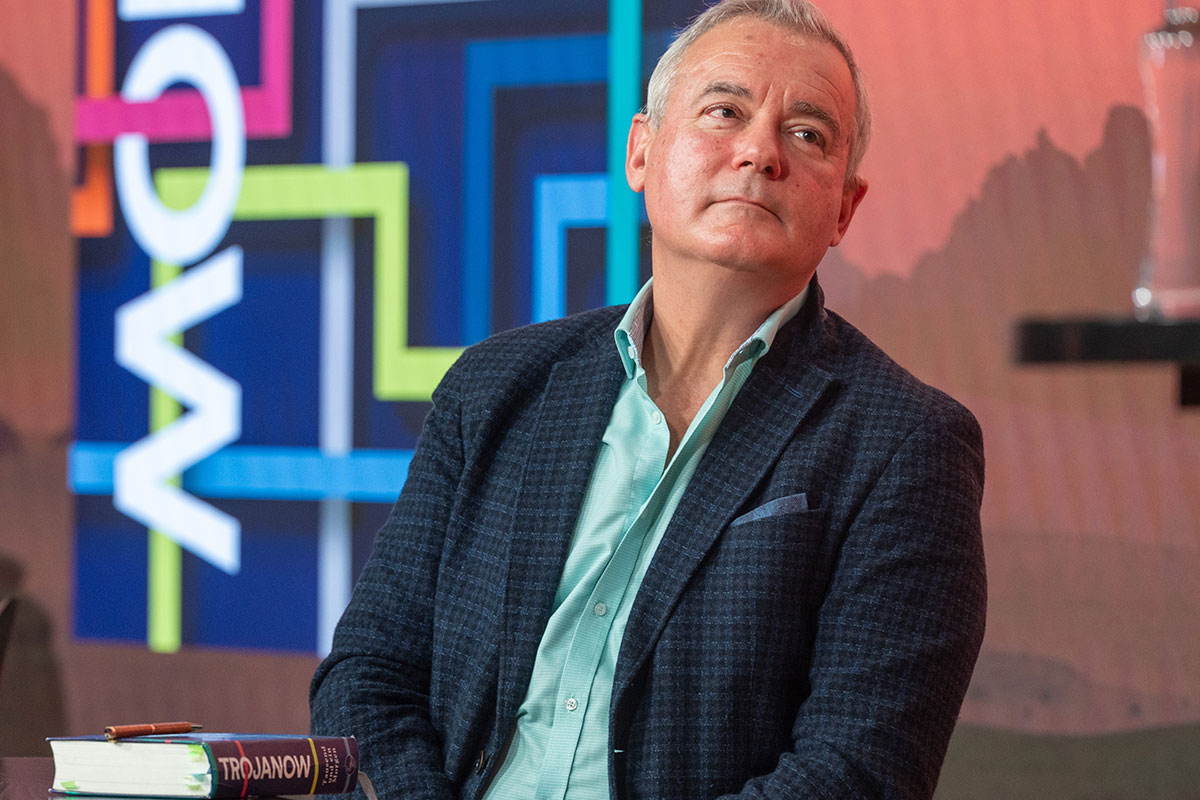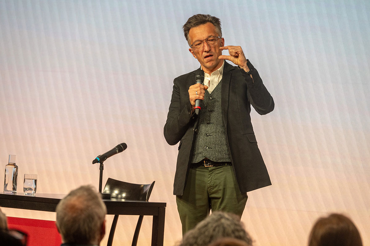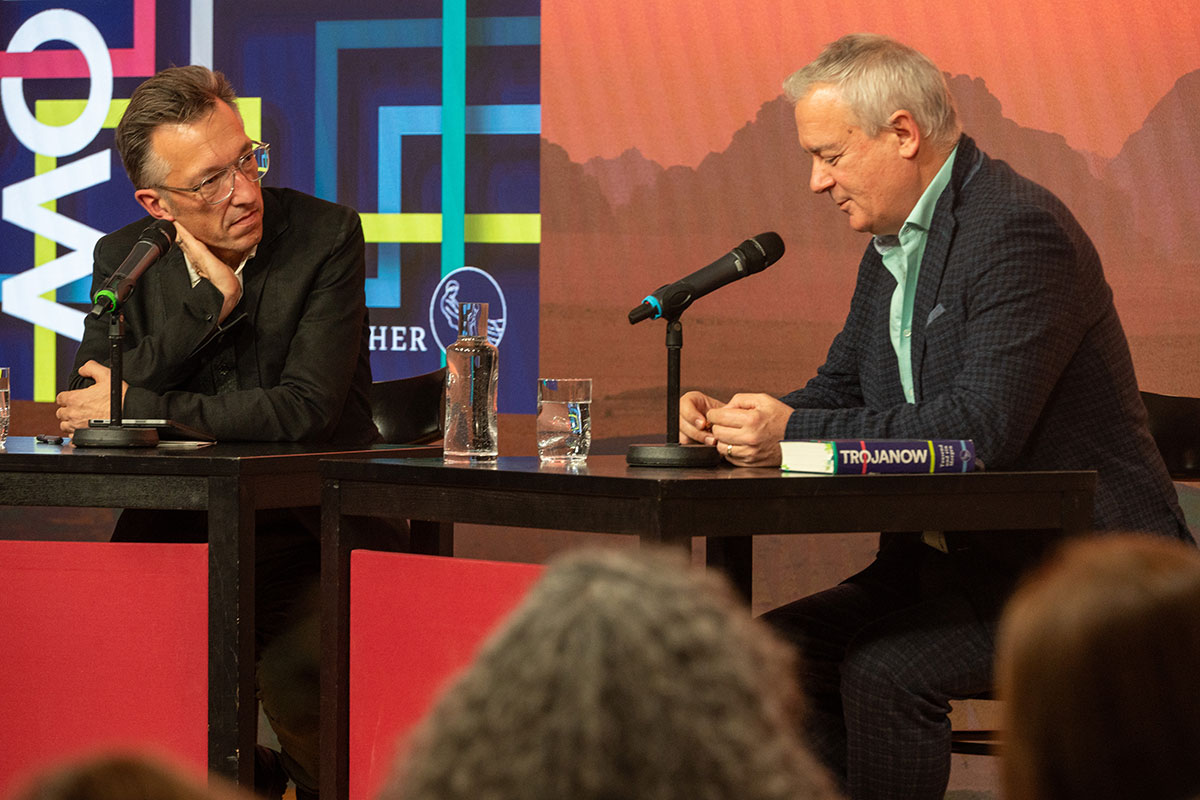 Im Anschluss auf der Bühne: der »Weltensammler« Ilija Trojanow, der bereits im Jahr 2007 den Essay »Kampfabsage. Kulturen bekämpfen sich nicht, sie fließen zusammen« (Blessing [s] zusammen mit Ranjit Hoskoté) veröffentlichte. In seinem neuen Roman »Tausend und ein Morgen« (S. Fischer) entwirft er die Utopie einer friedlichen und selbstbestimmten Gesellschaft. Märchen oder Möglichkeit?